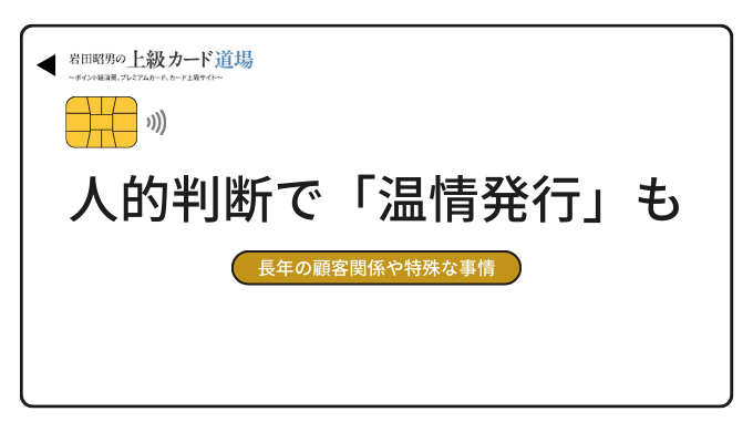 一部のクレジットカード会社では、機械的な審査では否決となった案件でも、人的判断により発行される「温情発行」が存在します。これは主に、長年の顧客関係や特殊な事情がある場合に適用されます。