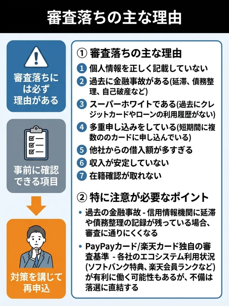 どちらも流通系カードに分類され、審査基準は比較的やさしいとされています。楽天カードの審査通過率は96.7%という調査結果があり、PayPayカードも同程度と考えられます。