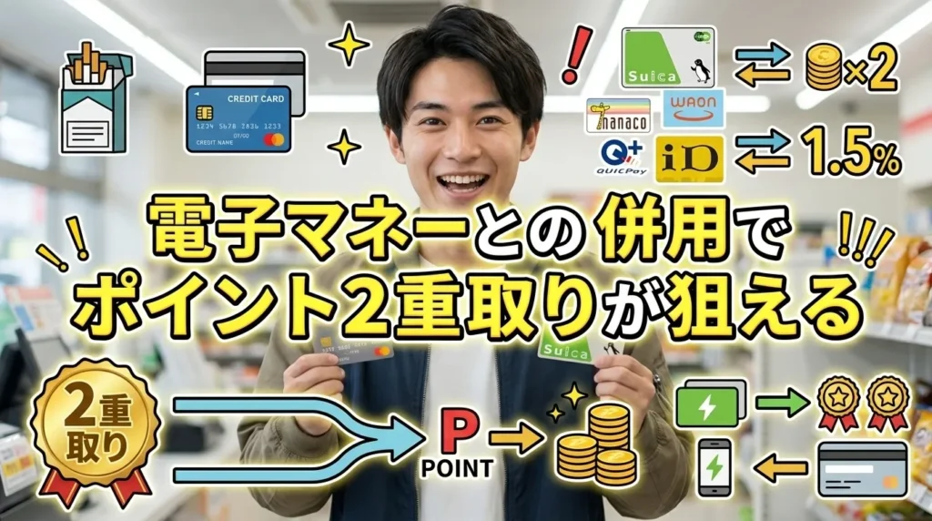 クレジットカードから電子マネーにチャージして、その電子マネーでタバコを購入することで、ポイントの二重取りを狙うことができます。ただし、タバコが電子マネー決済時のポイント付与対象外となっている場合は、チャージ時のクレジットカードポイントのみの獲得となります。