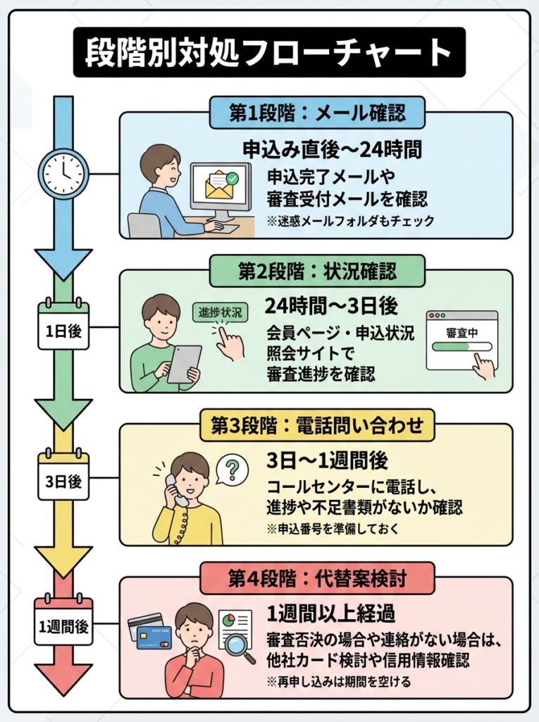 1週間以上同じ状況が続く場合は、追加の確認作業が行われている可能性があります。信用情報の詳細確認、在籍確認の必要性、書類の再確認などが考えられます。このような場合はコールセンターに問い合わせることをお勧めします。審査が長引くことは必ずしも落ちることを意味しません。
