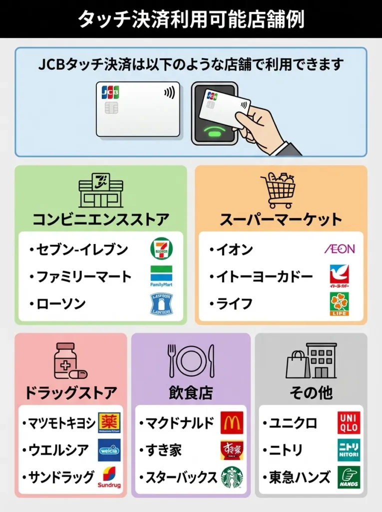 | 店舗でのタッチ決済 | JCB | スピーディーで便利 |