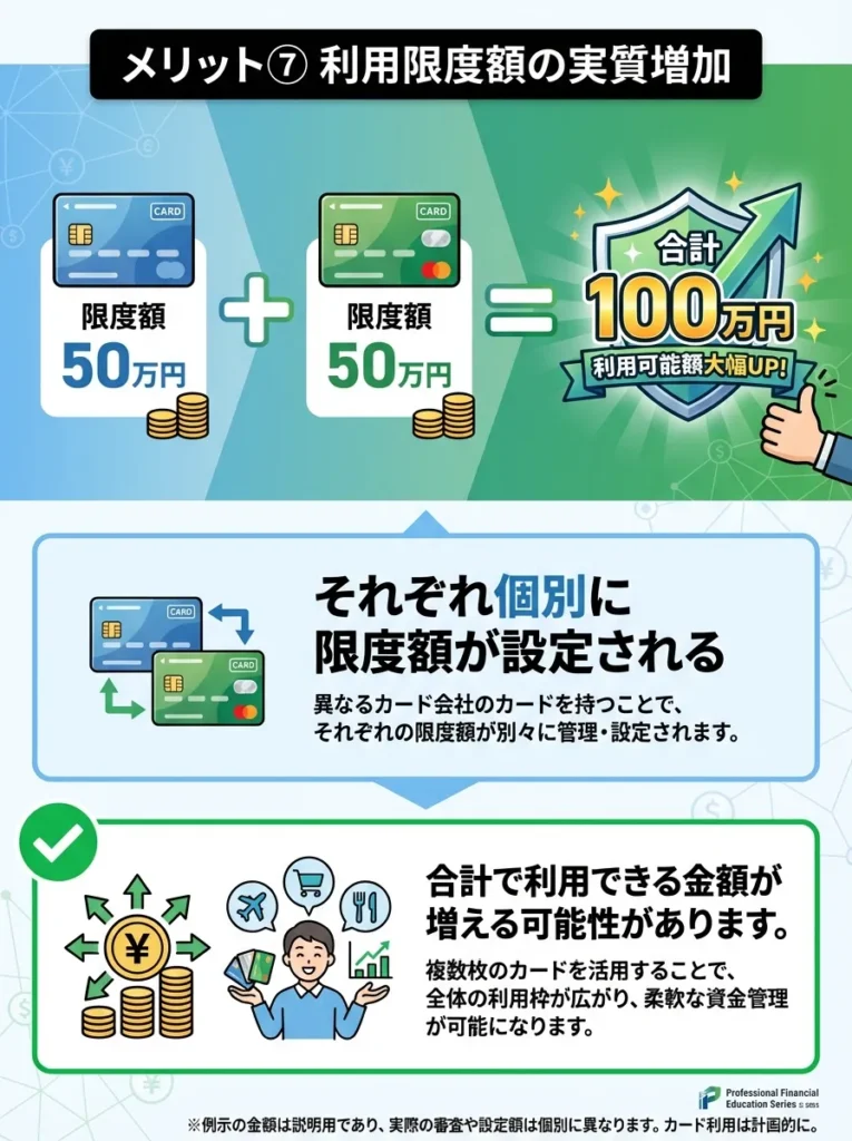 いいえ、それぞれ個別に限度額が設定されます。例えば、JCBカード50万円、VISAカード30万円の場合、合計80万円まで利用可能です。これにより利用可能額の幅が広がる場合があります。ただし、総与信枠の観点から個人の信用力に応じた適切な範囲内での設定となります。